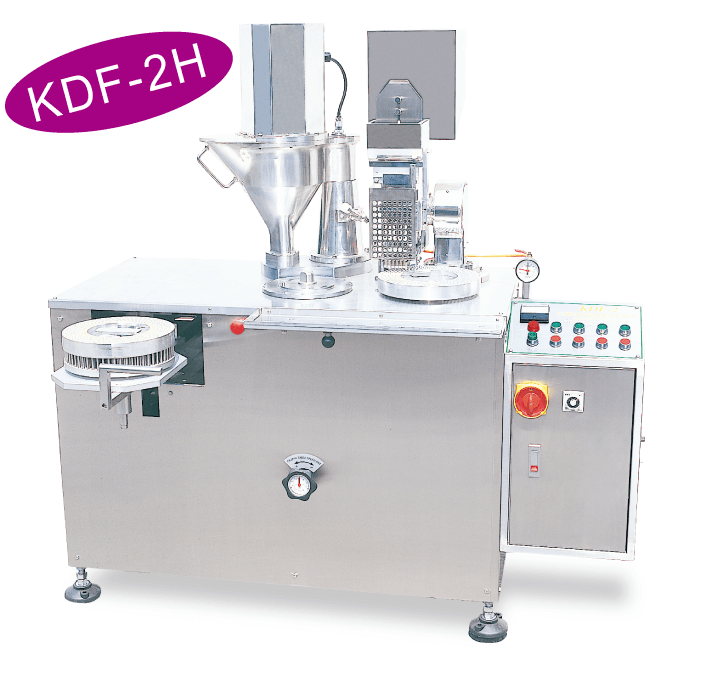 此設備是光大公司生產數千台直立套合式半自動膠囊充填機後,集數十年生產製造之經驗,進一步改良設計,推出其改良型水平套合式半自動膠囊充填機KDF-2H,該機種充填時不僅更快,操作上更是簡單,同時也更為精確和安全,對於流動性好的粉末及顆粒(圓粒)充填大大提升其效率,並降低膠囊損失率。生產時無任何噪音騷擾,加上清潔及保養更簡易,並符合cG.M.P.、PIC/S要求。